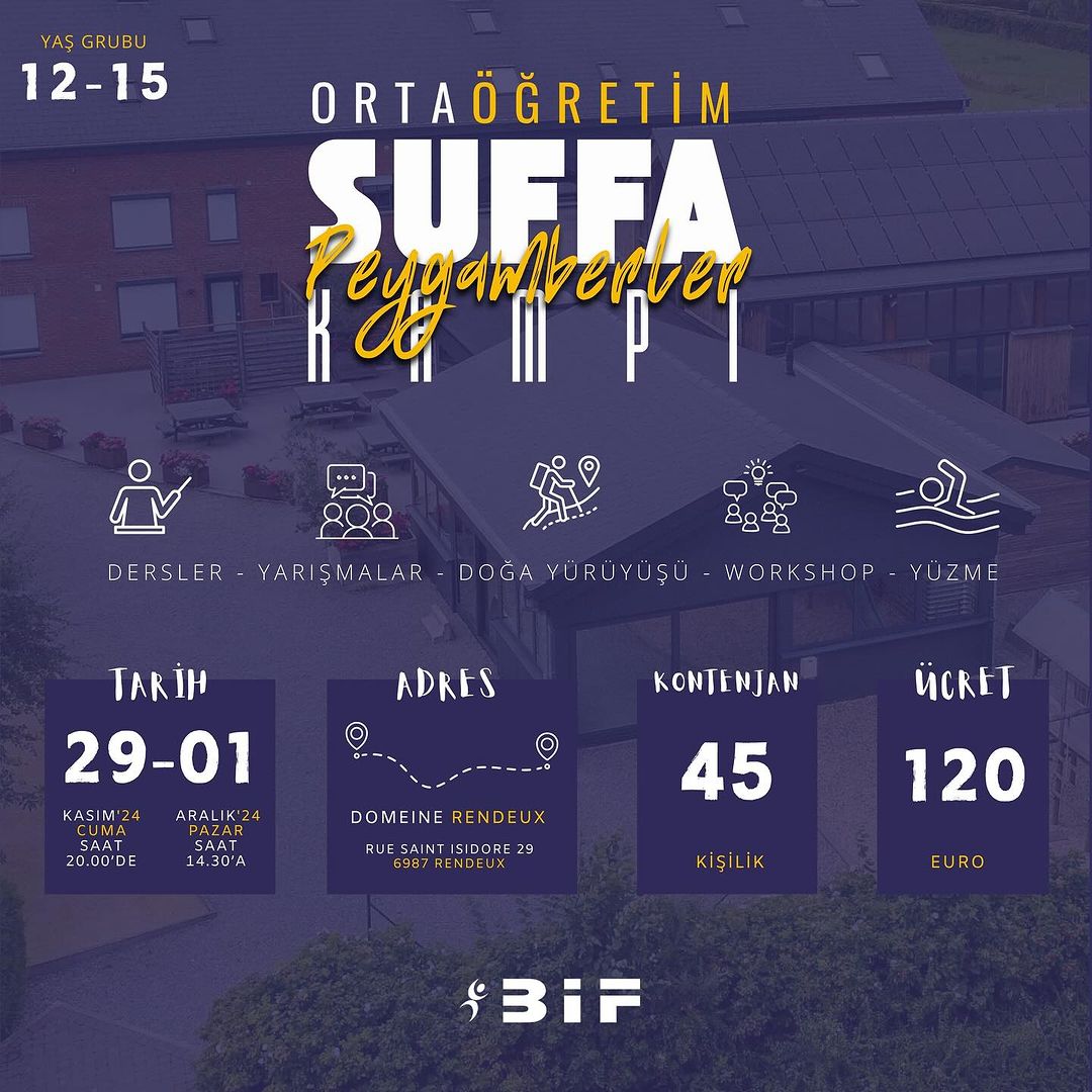 BİF Gençlik tarafından düzenlenen Ortaöğretim Suffa Kampı'nda, 12-15 yaş arası erkek öğrenciler ile 29 Kasım - 1 Aralık 2024 tarihleri arasında buluşuyoruz. Bu yıl programımızda "Peygamberler" teması işlenecek. Kampımızda doğa yürüyüşleri, yüzme etkinlikleri ve eğlenceli yarışmalar yer alacak. Ücret € 120 olacaktır, detaylı bilgi afişte yer almaktadır.